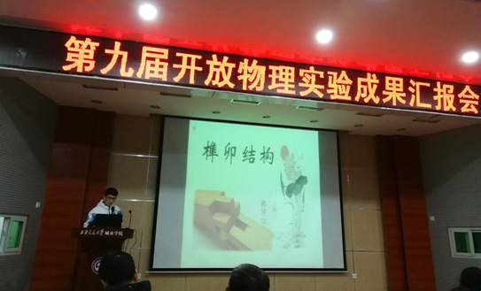 接下来,12个兴趣小组学生依次汇报了本届开放实验的工作,涉及到电磁炮的制作、JZ5型灵敏检流计的改进、寻迹避障小车、霍尔传感器测量发动机转速的应用、单臂电桥的改进、低成本演示仪器的制作、榫卯结构探究一斗拱制作、unity3D示波管教学软件制作等12项研究课题,成果形式丰富多样,包括幻灯片报告,视频展示和实物模型。从学生激情飞扬的汇报中可以看出,经过12周的学习和研究,各小组认真努力,准备充分,大部分小组得到了理想的结果。其中单臂电桥改进、JZ5型灵敏检流计改进、霍尔传感器的应用可作为自制实验设备为后续综合实验和其他实验教学作为案例教学。最后评出了一等奖5项、二等奖7项。