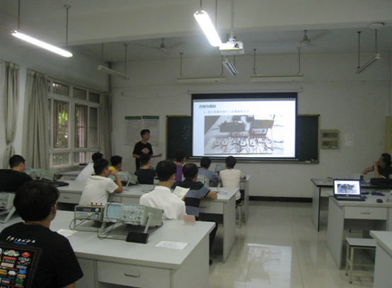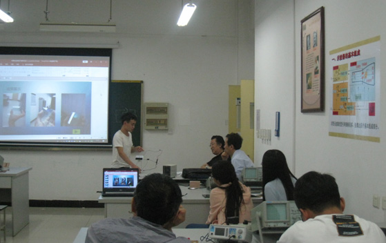 接下来,每个小组学生相互合作,对开放实验成果进行了汇报展示。李宏利老师带来的课题是读数显微镜结构与操作模拟软件制作,该课题利用flash软件的优势辅助传统教学,虚实结合,有利于提高学生学习兴趣。王新民老师带来的课题是平行梁自振频率的测定研究,拓展了霍尔式传感器交流激励实验。梁颖亮老师带来的课题是JZ 5型灵敏检流计的改造探究,改进了检流计的操作和精确度。雷玉明老师带来了两个课题,一是手机充电器的制作,二是物理实验小课堂,学生通过几个小实验演示了物理原理和规律,有助于大物教学。李育新老师带来的课题是unity3D教学软件制作,学生初步掌握了软件,并制作了一些模型。赵丽华老师带来的课题是白光全息,学生通过一系列实验探究,优化了大部分实验环节的具体参数。刘兆梅老师带来了 “驻波演示器”和闪光灯演示电容器能量两个课题,向大家展示了简易小巧低成本物理演示仪器。