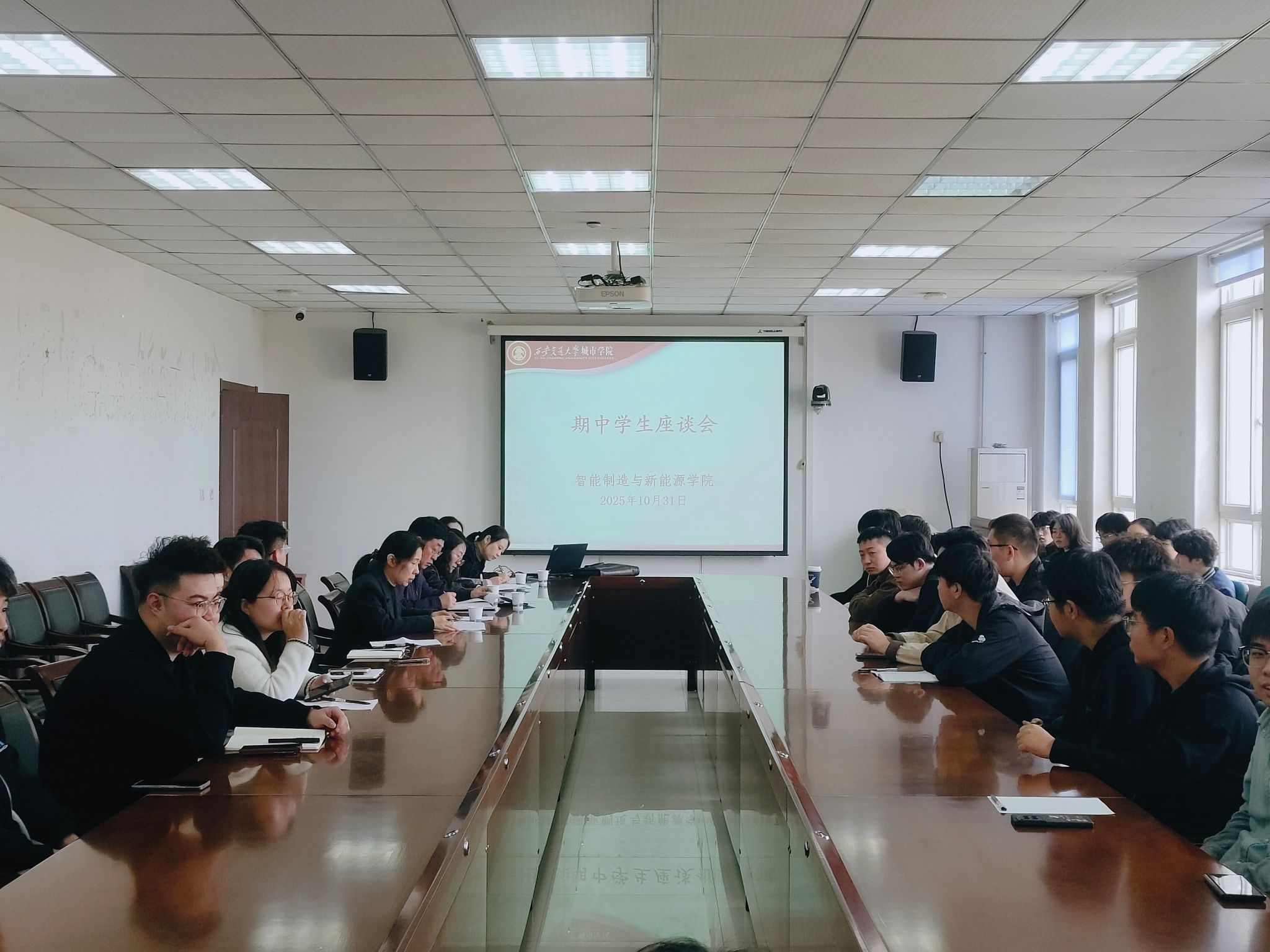 为精准掌握教学动态、切实解决学生学习困惑,智能制造与新能源学院于10月31日在行政楼504会议室召开期中学生座谈会。学院副院长竹有章、院长助理门静、机械工程及自动化系主任李娜娜、能源与动力工程系主任李莉、全体辅导员及各年级学生代表共50余人参会,围绕课程安排、英语四六级备考等核心问题展开深入交流。本次会议由学院院长助理王丽丽主持。