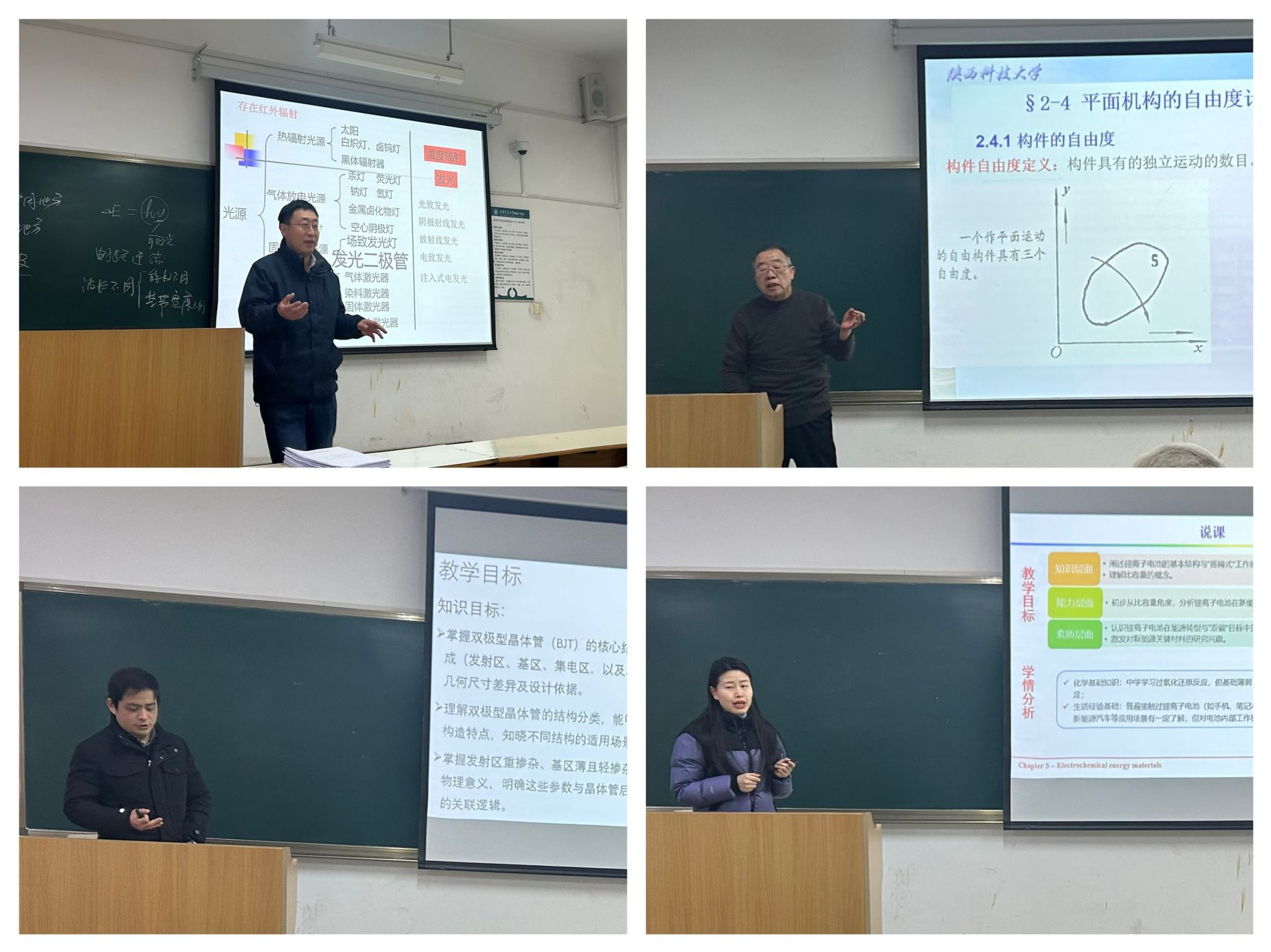 本次试讲活动聚焦《机械设计基础》、《光电子技术》、《微电子学基础》、《新能源材料概论》等多门核心课程。试讲过程中,授课教师们精心准备,结合课程特点与学生学情,清晰呈现了教学目标、核心知识点与教学思路。在《机械设计基础》课程中,教师系统讲解了自由度定义、约束类型及计算公式,并结合工程实例开展应用分析;《光电子技术》课程以光源发展脉络为切入点,串联起能级跃迁、半导体器件等专业知识,兼具理论深度与趣味性;《微电子学基础》与《新能源材料概论》课程则紧密贴合新能源专业特色,聚焦核心器件结构与关键技术原理,注重知识的实用性与行业关联性。