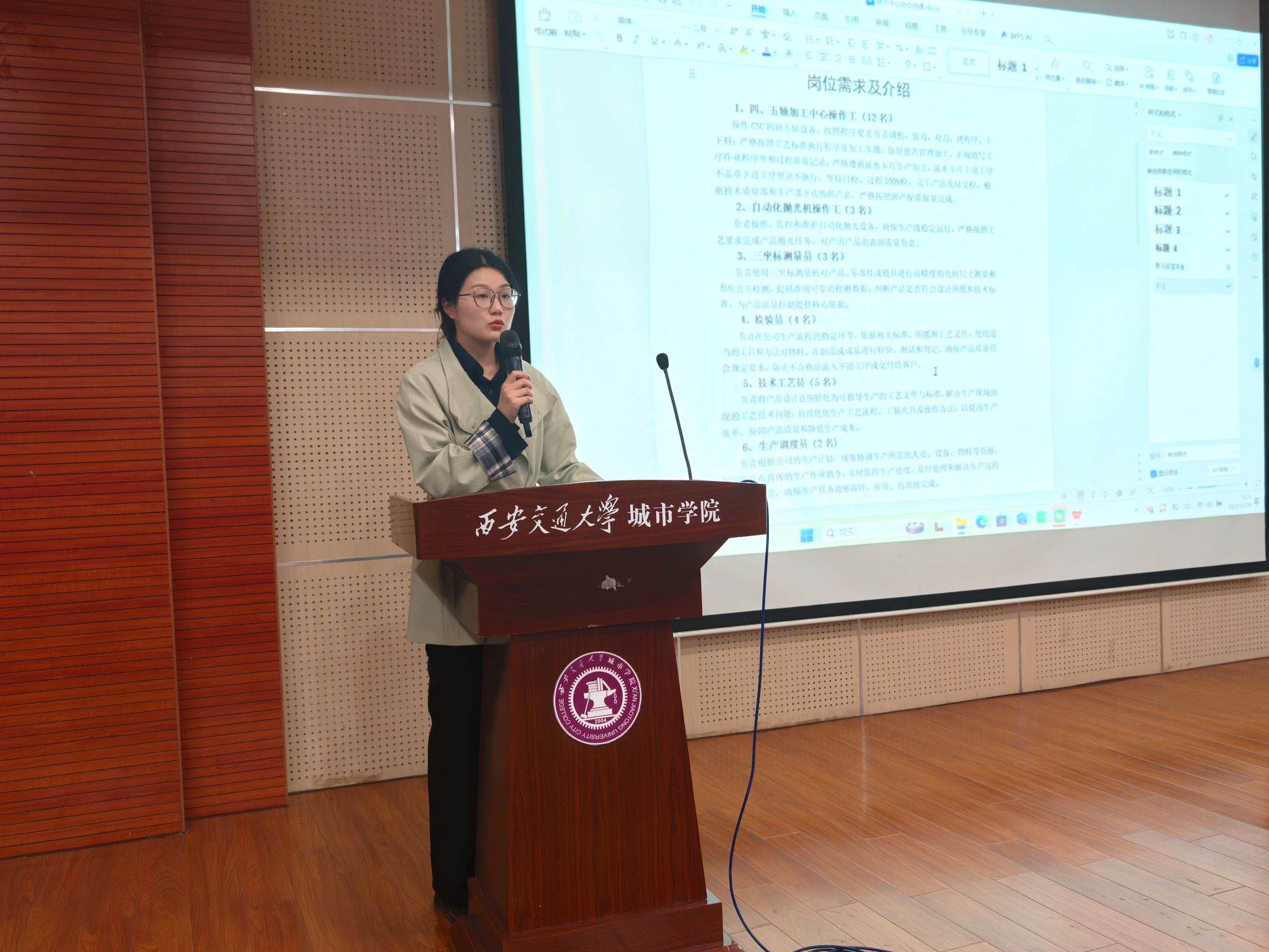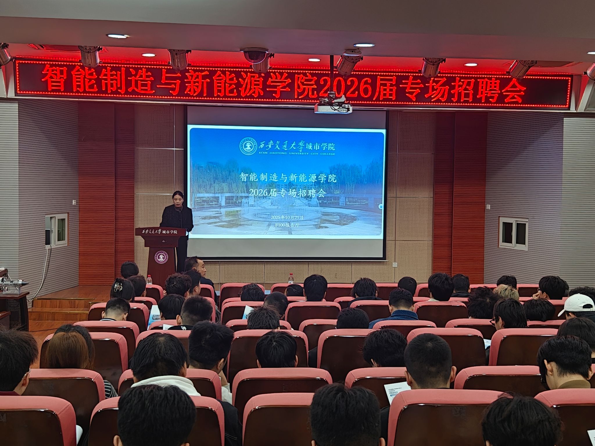 为深入贯彻落实国家关于促进高校毕业生高质量就业的决策部署,深化产教融合与校企协同育人机制,10月29日,智能制造与新能源学院联合西安群健航空精密制造有限公司在F100会议室举办“智启未来”2026届毕业生专场招聘会。本次招聘会由学院院长助理王丽丽主持,西安群健航空精密制造有限公司经理任兴平、人事经理程育清,学院2026届毕业班辅导员王令以及学院百余名毕业生共同参与。